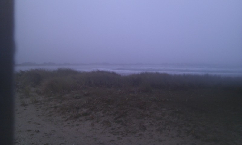 Notre zone presse est placée à la pointe de la Torche et surplombe la plage de Pors Carn, de quoi ressentir pleinement les effets du vent qui se font bien sentir actuellement avec l'arrivée de la pluie !