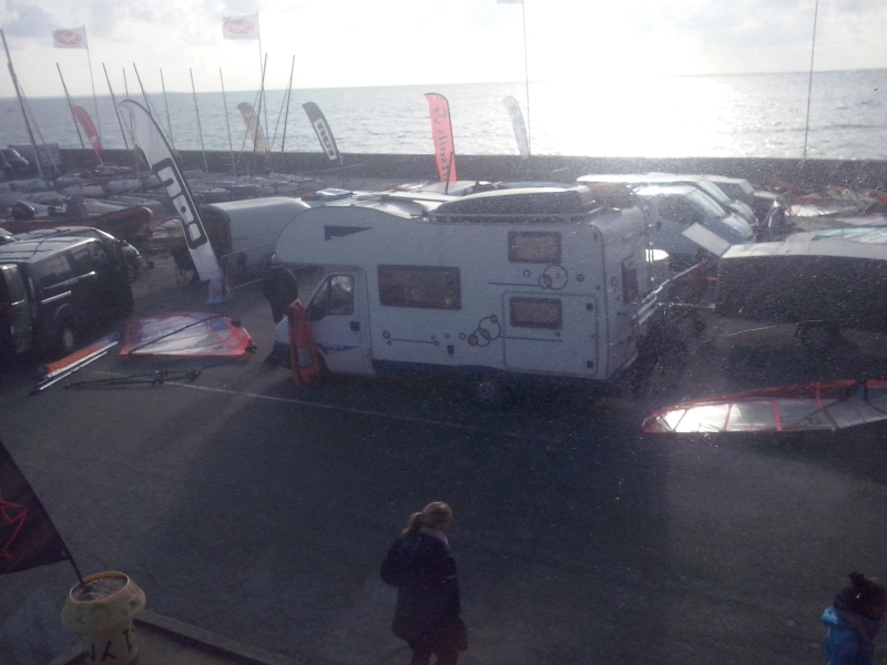 1er départ prévu 10h30 ça plane. Vent de sud 12-15 noeuds annoncé forcissant toute la journée.Les coureurs gréent....tout! Au moins 3 voiles en fonction de la prévision