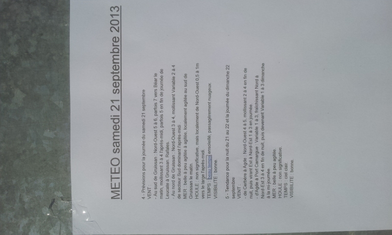 La météo pour aujourd'hui annonce force 5-6 ce matin faiblissant 5 dans l'apres midi et ce matin le vent est plus fort que les prévisions ! Top !Briefing de 9h [21/09/2013, 09:10:02]