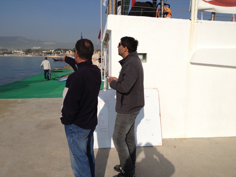 Bernard et Tristan réfléchissent et regardent le plan d'eau pour imaginer le parcours à venirBriefing [15/03/2014, 09:03:00]