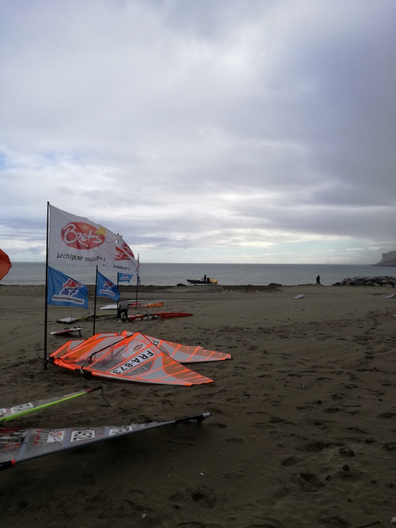 Les inscriptions sont bientôt terminées et la pluie s'invite sur le spot. Le vent est fort et irrégulier pour le moment...