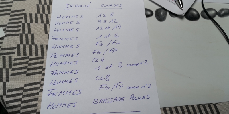 Déroulé des poulesVoici l'ordre qui est prévu pour les poules de courses. A noter qu'il n'y a pas de rappel général avant les finales, les coureurs sauront si ils sont disqualifiés en regardant un tableau à l'arrière du bateau arrivée
